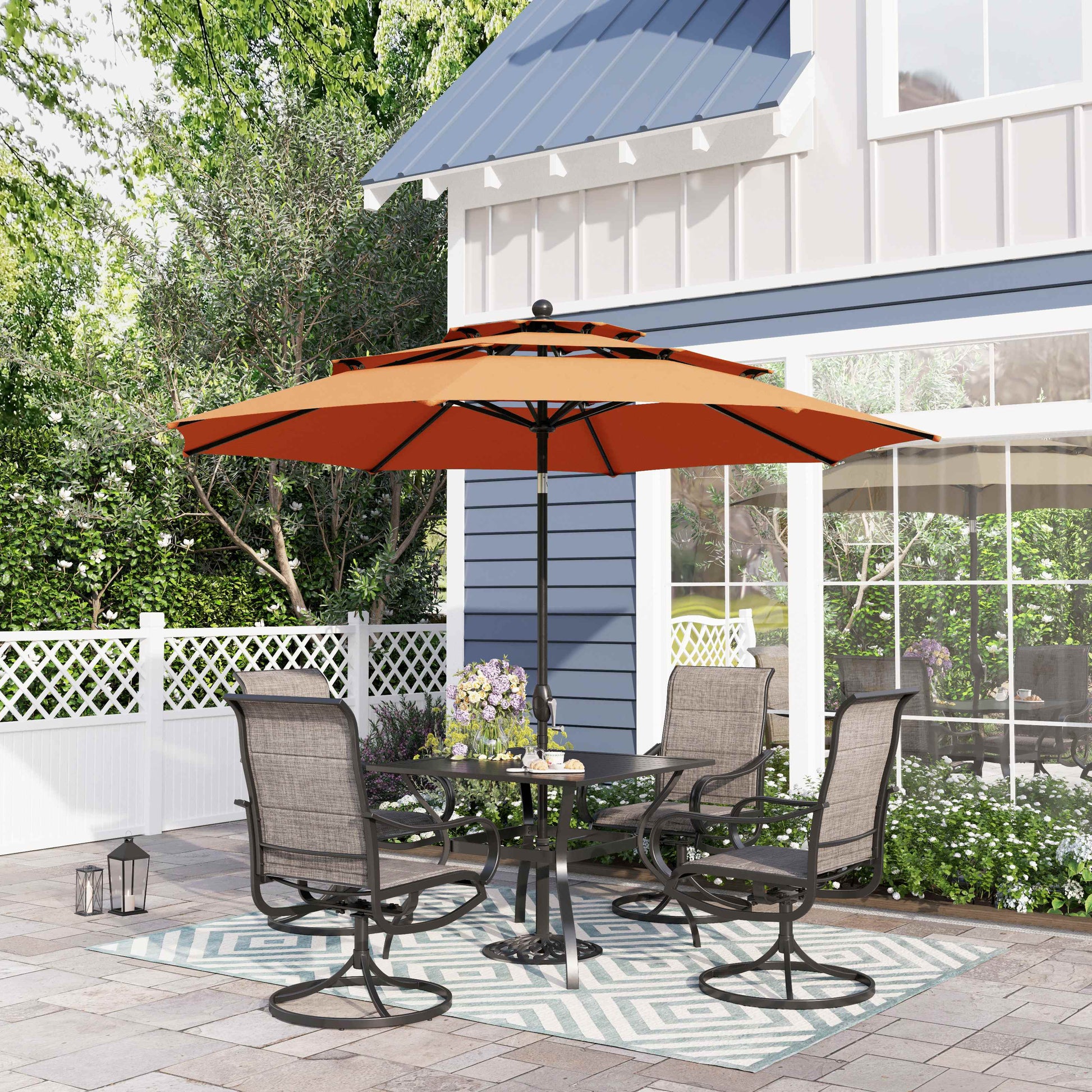 Upgrade your outdoor living with our Sophia & William 6-piece dining set. The set includes 4 textilene chairs, 1 steel table, and a 10ft umbrella. The umbrella provides ample shade with its large 10ft diameter canopy and features a 3-tier vented top for better air circulation. Made of durable and lightweight aluminum, the umbrella also has an auto-tilt function for easy angle adjustment, a user-friendly crank handle for quick open and close along with fade-resistant & UV-protected canopy. The table is made from high-quality steel with both e-coating and powder coating, which is resistant to rust and all weather conditions. It also has a convenient 1.57" umbrella hole suitable for most umbrellas. The chairs are made of foam-padded textilene fabric that is soft and comfortable. Each chair offers a 360-degree swivel design and ergonomic seat/backrest for added comfort. Don't wait, order today and elevate your outdoor space with our premium set!
