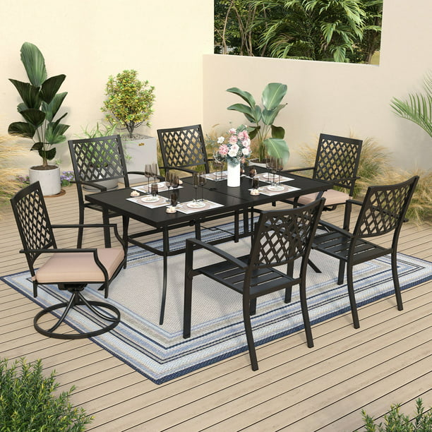 This Sophia & William Patio Dining set is modern and durable, including 1 large dining table, 4 stackable chairs and 2 swivel chairs. Made of heavy-duty steel frame with E-coating & Powder-coating treatment, which is double anti-rust process for long term use and easy to clean.