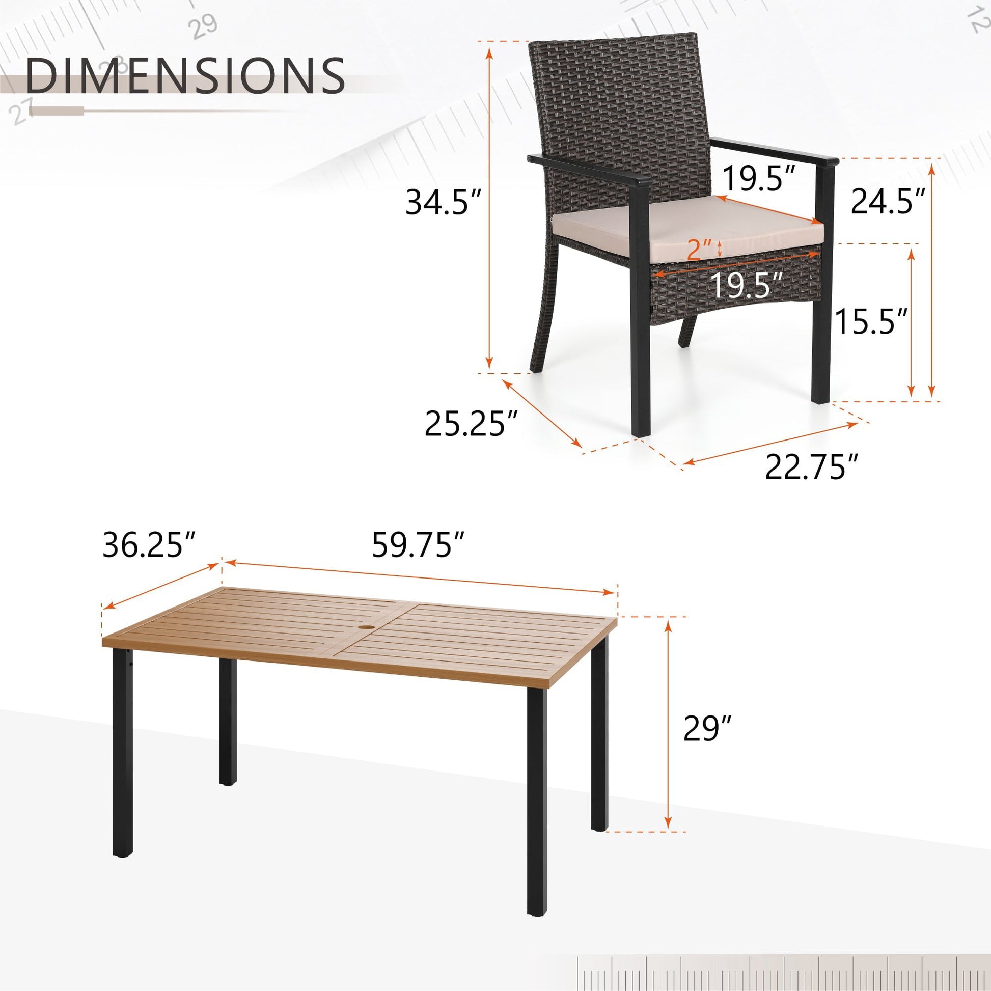 Enhance your next birthday party, holiday gathering, or daily routine with the Sophia & William 7-Piece outdoor patio dining set! The set includes 6 rattan cushioned chairs and 1 steel table with umbrella hole. With both e-coating and powder coating, our steel table is weather resistant, rust-resistant and easy to clean. The 59.75" x 36.25" tabletop with 1.5"-2" umbrella hole is not only large enough for 6 people’s outdoor dining but also can be combined with an umbrella as a shade during hot or rainy days. Natural teak-grain color is produced with unique painting process by hand, which is very long-lasting.The chair features a powder-coated heavy duty steel frame and premium PE rattan, so it is much more rust and weather resistant than other common chairs. The removable zippered cushion is high quality with good resilience, soft and comfort, no slide, no sunken after long time use. You’ll surely enjoy yourselves if you buy the set.