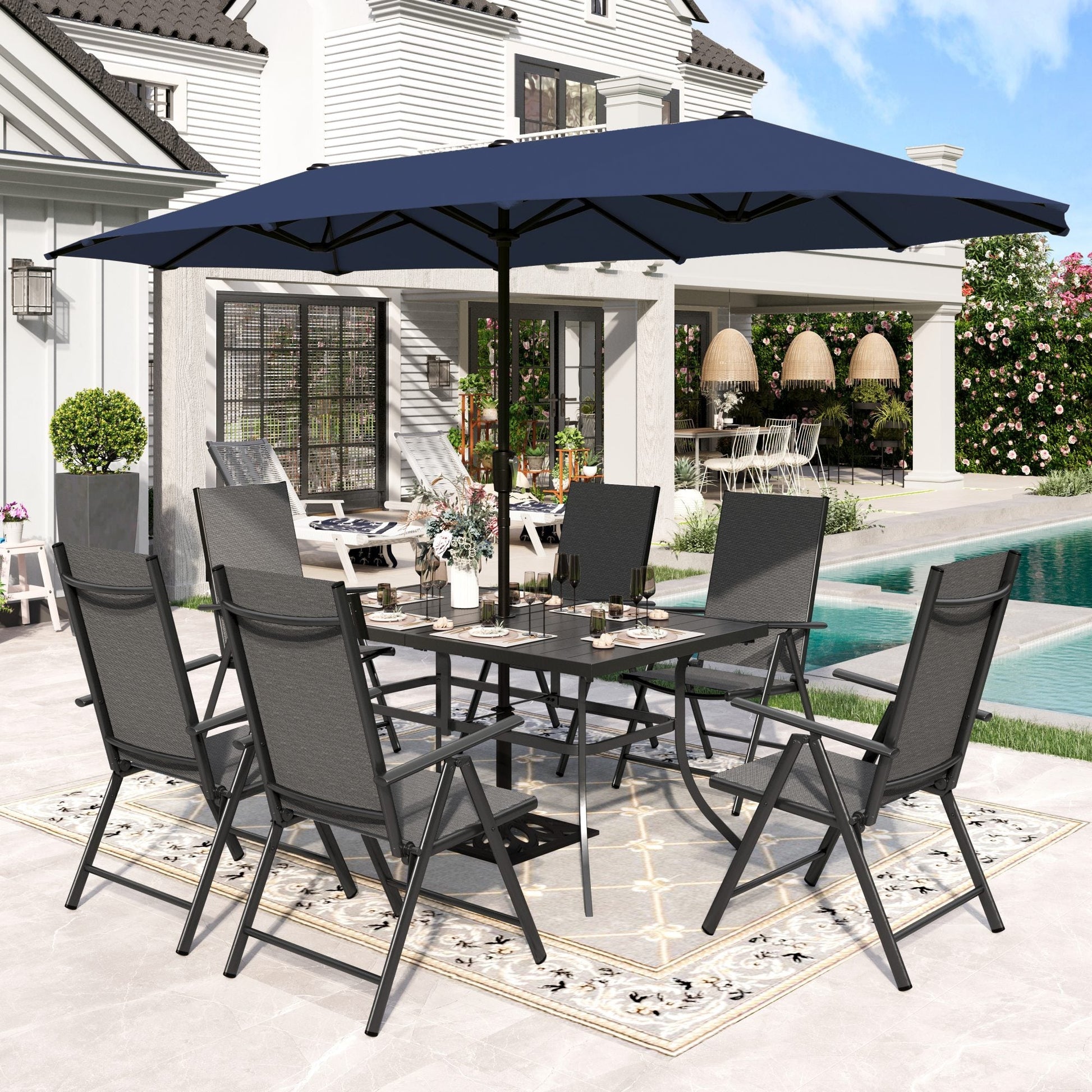 Sophia & William 8-Piece Outdoor Patio Dining Set with 13ft Navy Umbrella, Black Folding Chairs & Rectangle Table for 6