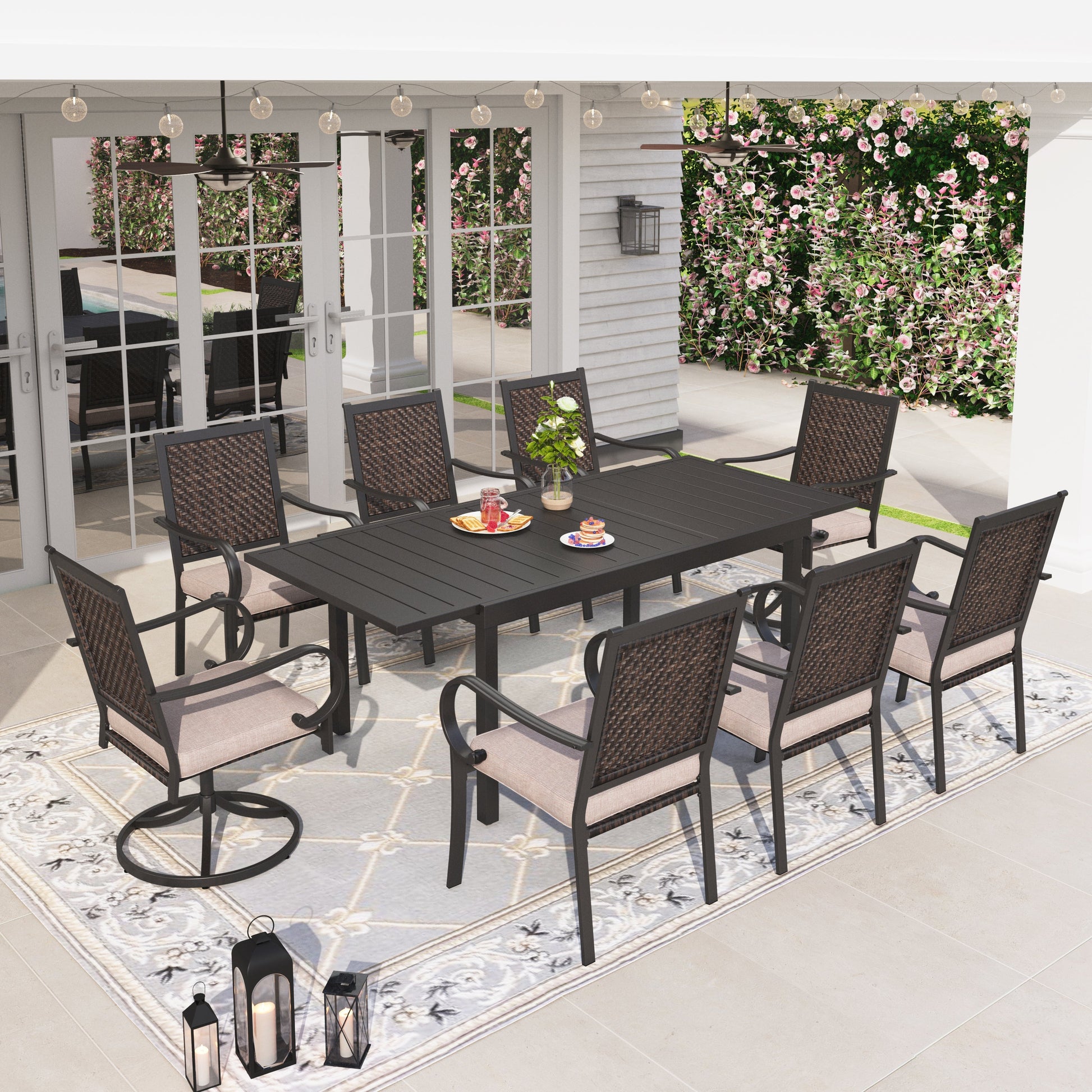 Sophia & William 9 Pieces Outdoor Patio Dining Set with Swivel & Fixed Wicker Chairs and Extendable Steel Table for 8-person