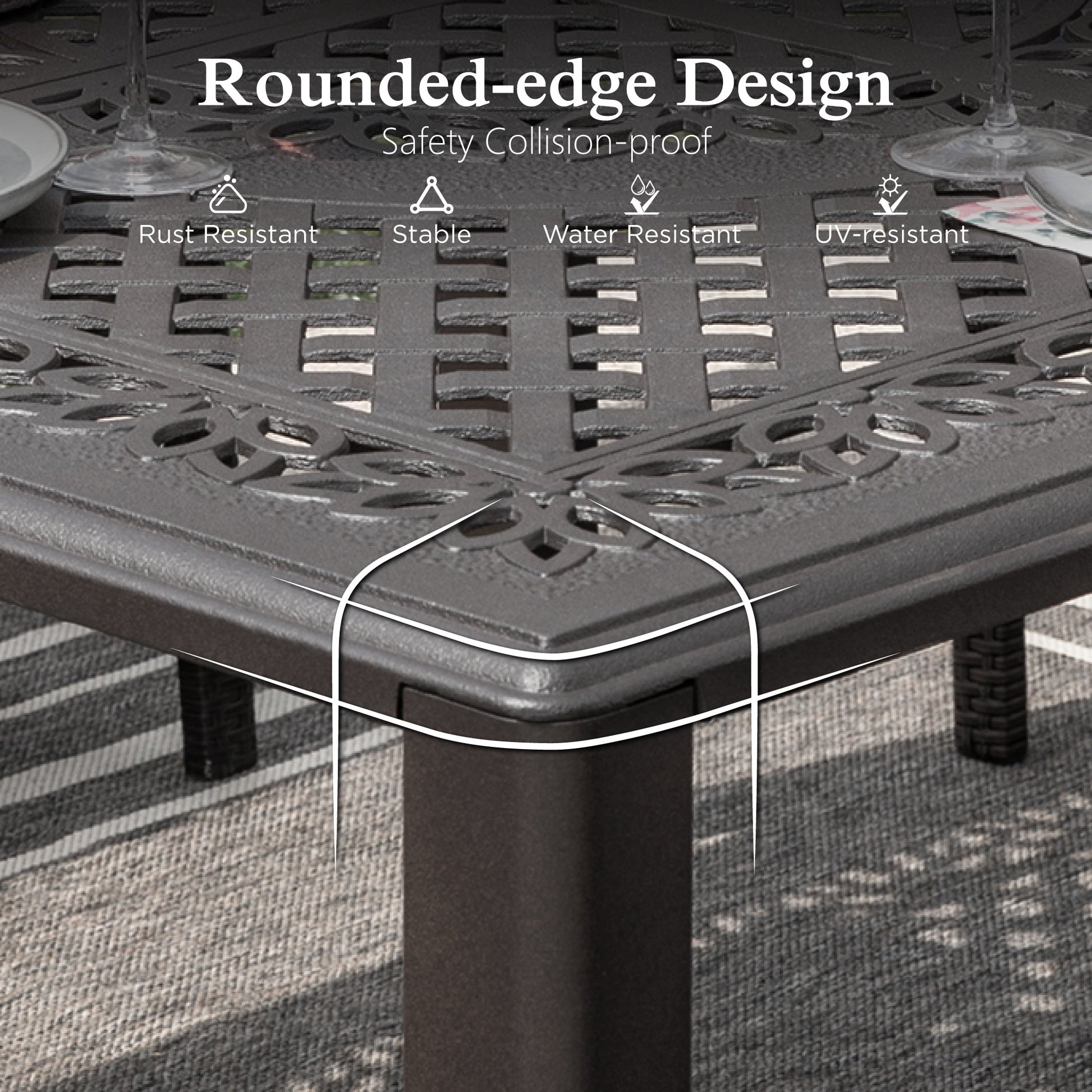 This set includes 8Pcs cushioned wicker rattan chairs and 1Pc table. Crafted from durable cast aluminum with e-coating and powder coating, our table's 53" square tabletop offers ample space for dining and entertaining. Also, it is beautifully adorned with a delicate lattice flower pattern, adding a touch of elegance to your patio. When it's dirty, just wipe it with a damp rag and it will be fine.
