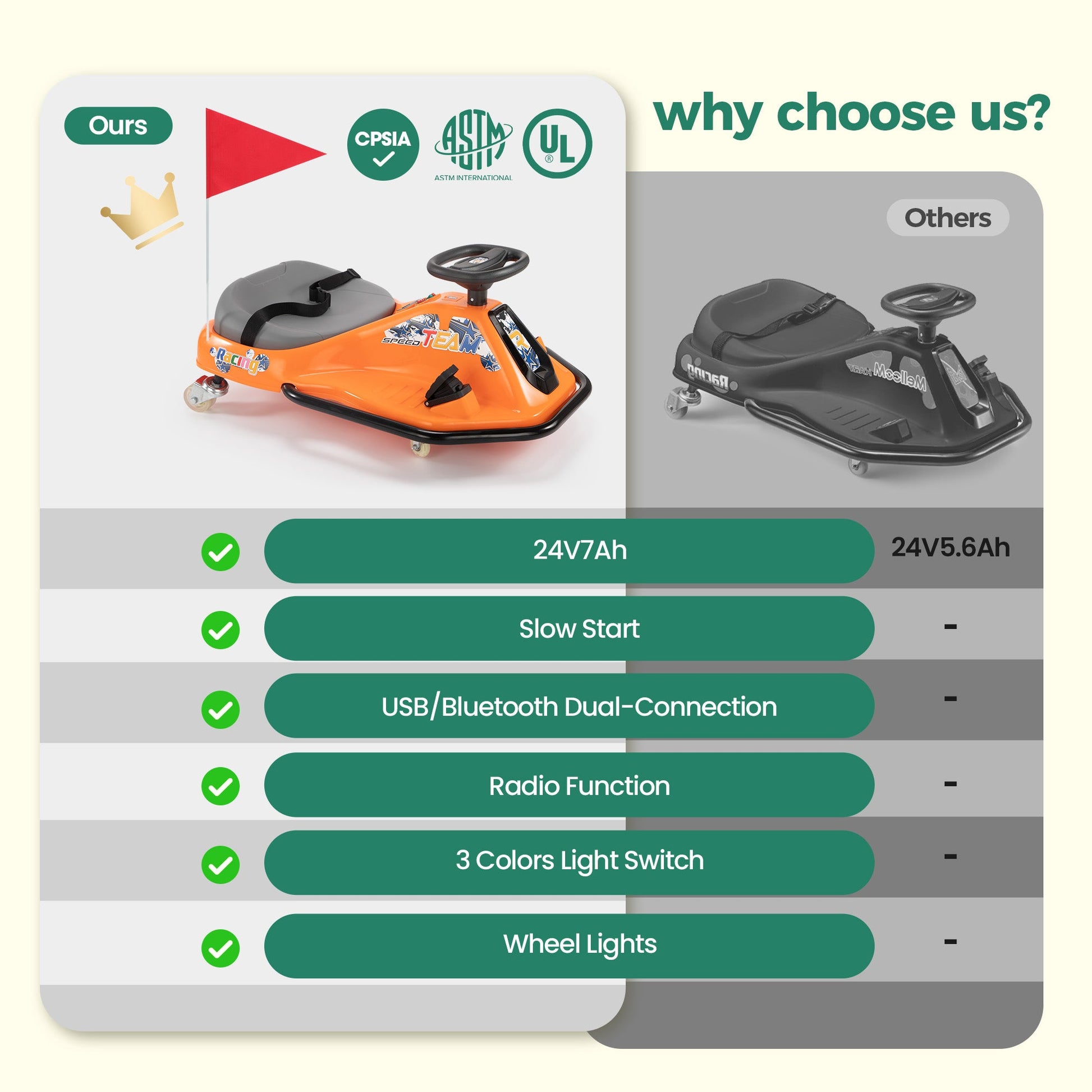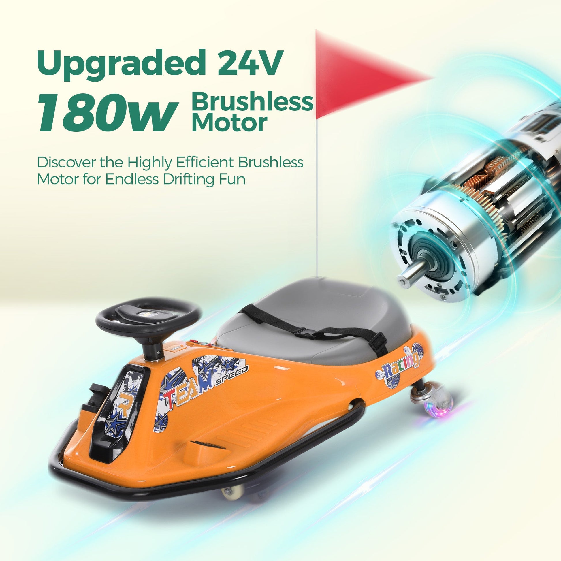 Alpha Joy Kids Crazy Drift Car 24V 180W Electric Drifting Go-Kart w/Rechargeable Battery, Colorful Light, Bluetooth Music & Safety Harness, Orange